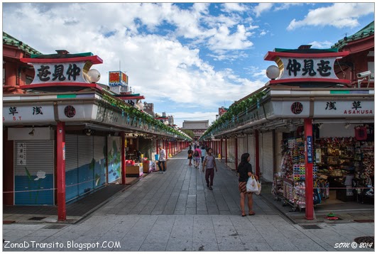 Para ir al templo Sensoji el visitante debe entrar primero a través del Kaminarimon (La puerta del Trueno), la puerta exterior de Sensoji de 11,7 metros.