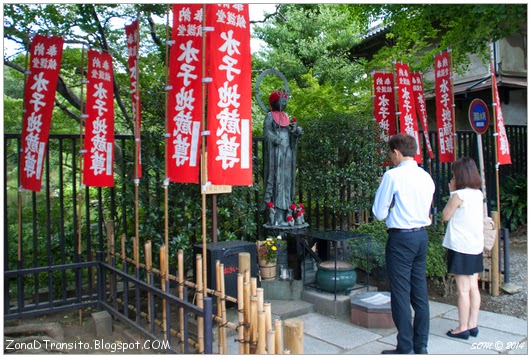 Nos gustó también mucho un pequeño templo, situado a la entrada del jardín ….. que parecía estar dedicado a algún dios de la fertilidad, en su entrada había una pareja rezando frente a una estatua de un Jizo grande a cuyo pies se arrodillan pequeños jizos, todos ellos con sus característicos gorros rojos de lana.