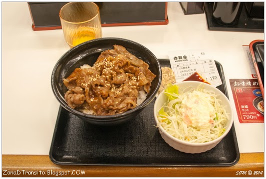 De vuelta al hotel paramos a comer en un restaurante de la cadena Yoshinoya. Había leído buenas críticas, y tengo que reconocer que tiene un precio sin competencia y la comida estaba correcta, eso si, al menos en ese caso, la limpieza del local dejaba mucho que desear. Cenamos los dos por 1.120 JPY (Dos platos combinados de carne y pescado).